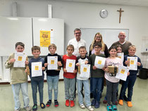 An der diesjährigen Mathemeisterschaft haben aus den Klassen 4a und 4b insgesamt 9 Schülerinnen und Schüler teilgenommen. Sie knobelten um die Wette und lösten auch schwierige Aufgaben. Als Belohnung für ihre Anstrengung bekamen sie von Herrn Wehner, als Vertreter der Raiffeisenbank, ein kleines Geschenk überreicht.