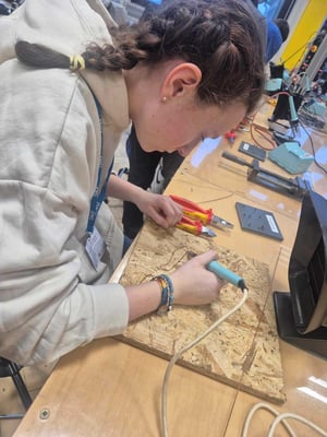 Die erste Station, die wir dann hatten, war das Löten und die CNC-Maschine. Wir haben ein Flugzeug aus Draht gelötet und wir konnten uns einen Schlüsselanhänger mit unserem Namen gravieren. Natürlich hatten wir Hilfe von Azubis, die uns erklärt haben, wie wir vorgehen sollten und wir durften die erstellten Dinge auch behalten.