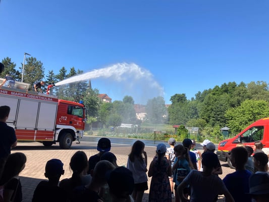 Zum Abschluss der Brandschutzerziehung durften die 3. Klassen die Feuerwehr in Oberthulba besuchen. Herr Stürzenberger und seine Feuerwehrkameraden erklärten alle Fahrzeuge und die notwendige Ausrüstung. Besonders staunten wir über den Einsatz der Rettungsschere bei einem Autounfall. Am Ende hieß es dann noch „Wasser marsch!“