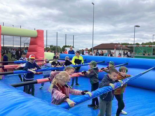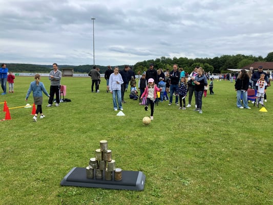 Am Schulfest selbst hieß es auch für die Eltern, Geschwister sowie alle anderen Anwesenden selbst aktiv zu werden. Hierzu hatte sich das Kollegium mit ihren Klassen unterschiedliche Stationen ausgedacht. Darunter befanden sich ein Menschen-Kicker, interessante Duelle auf dem DFB-Feld, Torwandschießen, Fußballgolf und auch andere witzige Stationen, die zu absolvieren waren.