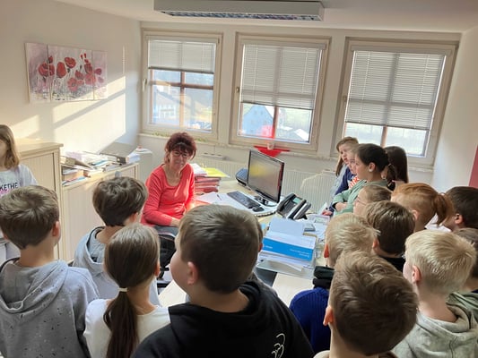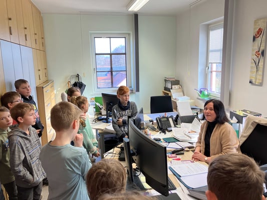 Für die beiden 4.Klassen nahm sich unser Bürgermeister Herr Götz viel Zeit. Die Schüler und Schülerinnen durften im Sitzungssaal Platz nehmen und ihre zahlreichen Fragen stellen. Besonders interessant war der Rundgang durch die einzelnen Ämter des Rathauses. Neugierig schauten die Kinder den Angestellten über die Schulter. Zum Schluss beantwortete Herr Götz auch noch die wichtigste Frage: Wo ist das goldene Buch der Gemeinde? Welche Prominente haben schon reingeschrieben? Zu gerne hätten sich die beiden Klassen dort auch verewigt.